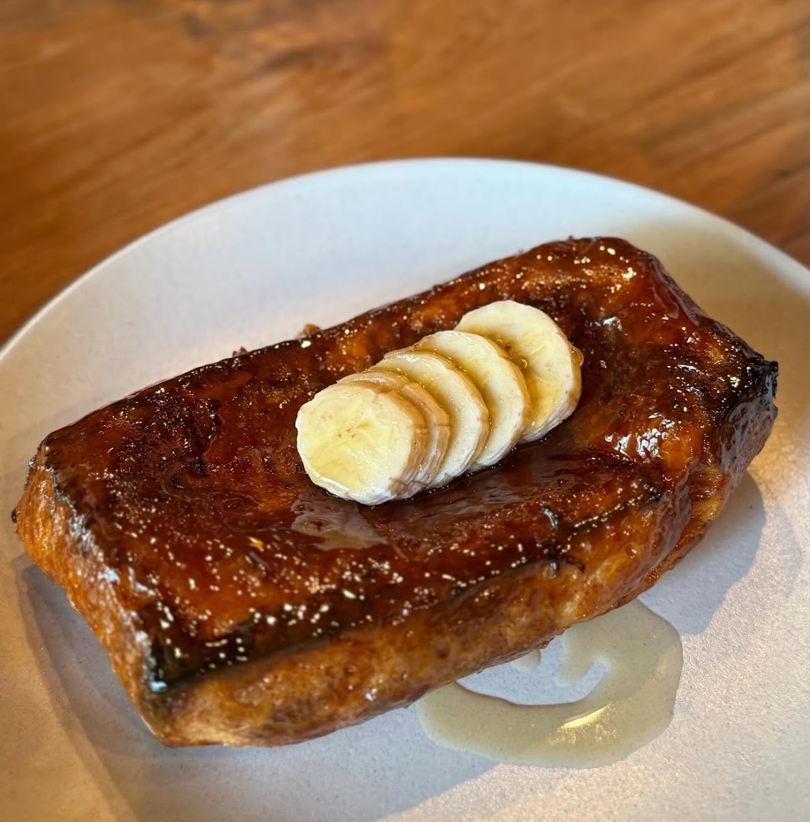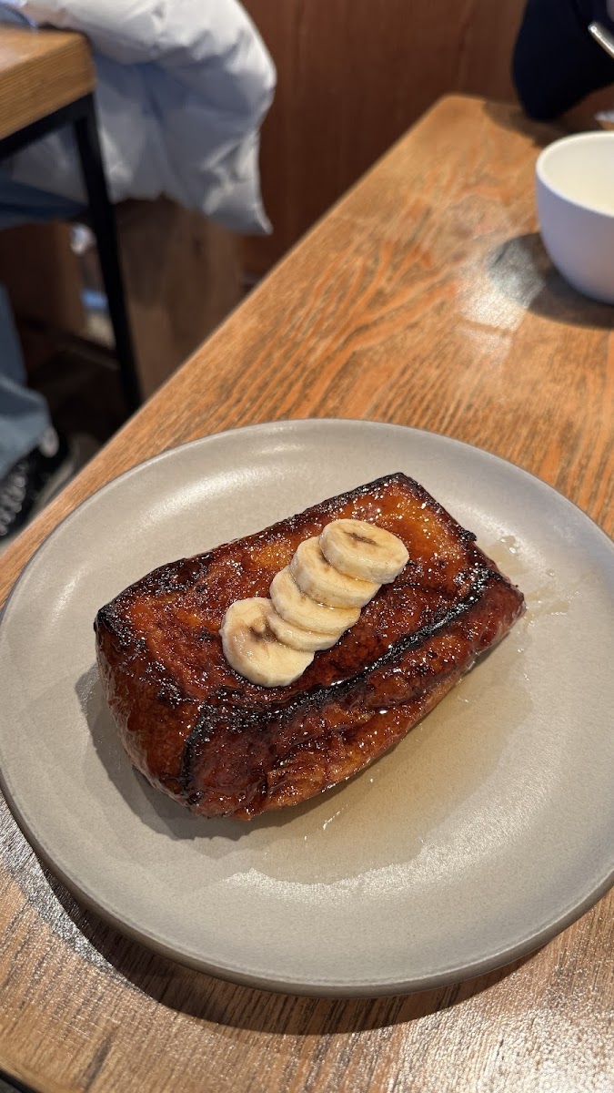 The crème brûlée of French toast Came to try their French toast and wasn’t exactly what I expected. Really rapped in caramelized sugar. Feels like a huge creme brûlée you’d share after a main dish The sugar was pretty hard and was really sweet. The banana was a nice touch, wish it came with more They do have a weird rule that 1-2 people can only order one. 3-4 people can only order 2 I think I’d come back to try after a main meal somewhere else . . . The only issue is that it sells out fast. I came before at 2pm and 1pm and it was sound out Cafe itself was pretty loud